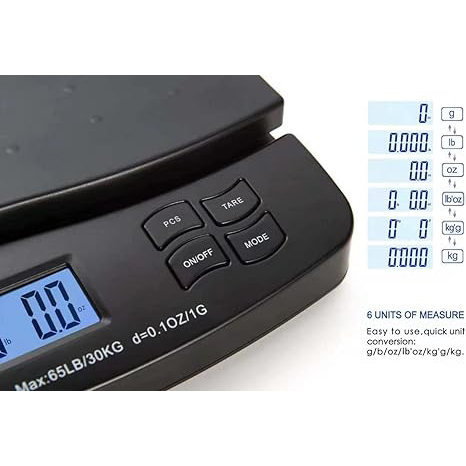 - 65 pound (30kg) capacity reads to 0.1 ounce (1g) in 0.1 ounce increments; minimum load weight is 0.2 ounces (5g)