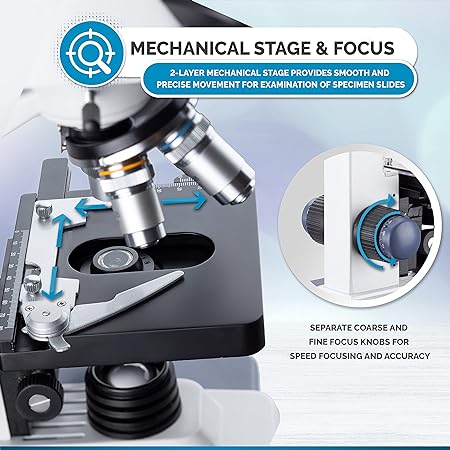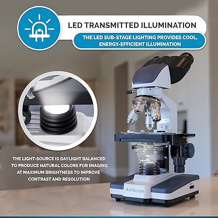 - 6 wide-field magnifications levels from 40X to 2500X for viewing a large range of specimens including fixed and live cells, bacteria, and more
