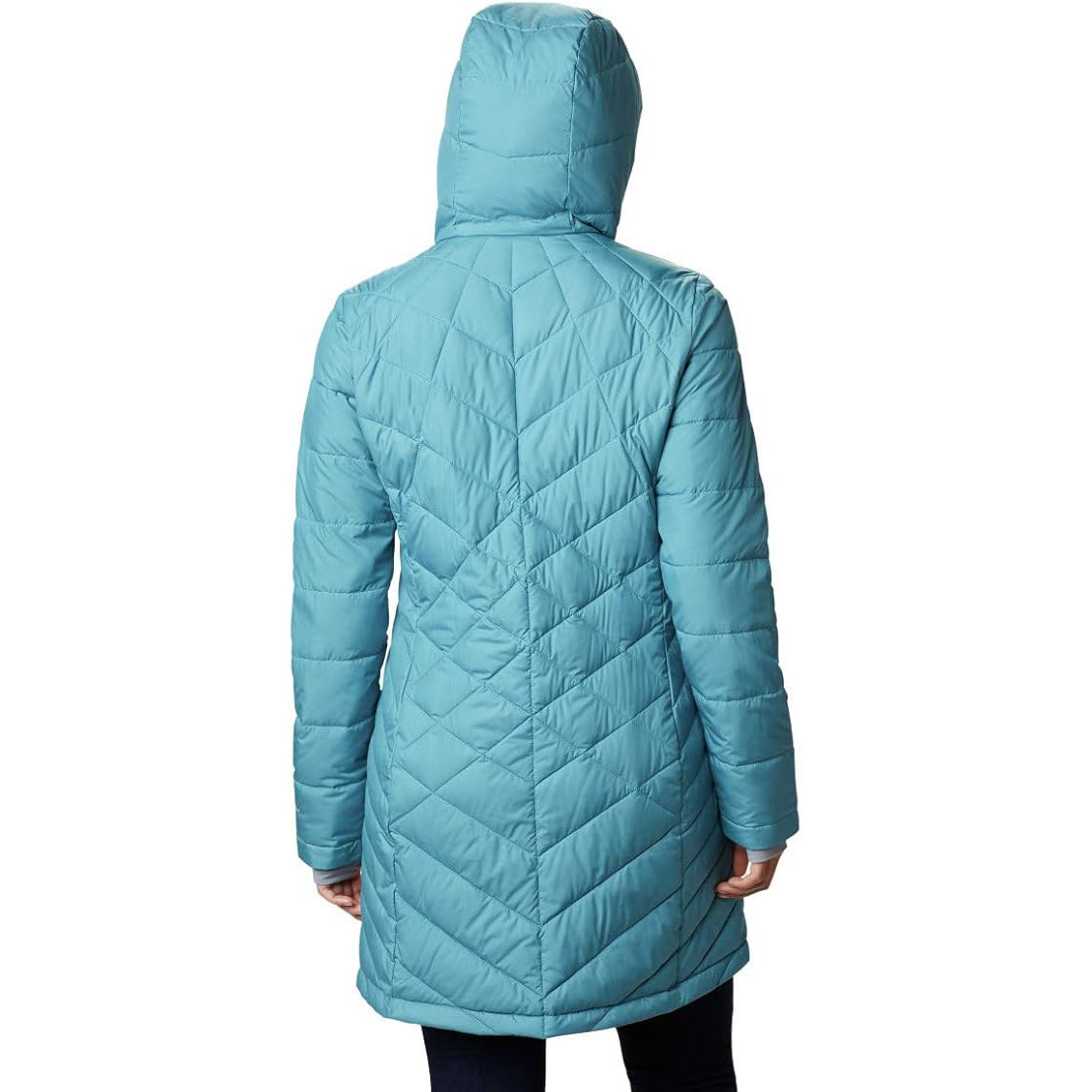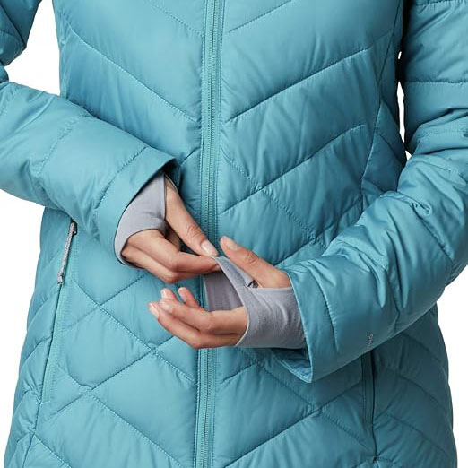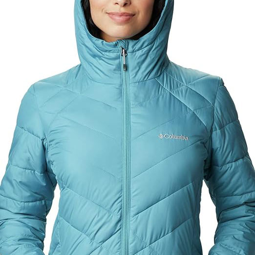 - Columbia women’s heavenly long hooded jacket features Omni-Heat reflective technology, a 100% polyester Synthetic down lining, and handy features to keep you cozy and protected during weather-heavy days.