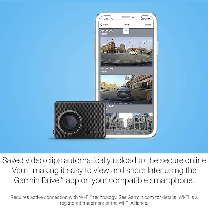 • Garmin Dash Cam – Access the camera remotely for Live View monitoring (requires constant power and an active Wi-Fi connection; access via the Garmin Drive app on your compatible smartphone) when you’re away from your parked car.