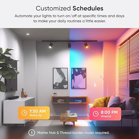 - [Set Schedules] Automate your lights to turn on/off at specific times and days to make your daily routines a little easier. Set your schedule using the Apple Home app, Google Home app or any other Matter-compatible app or voice assistant.