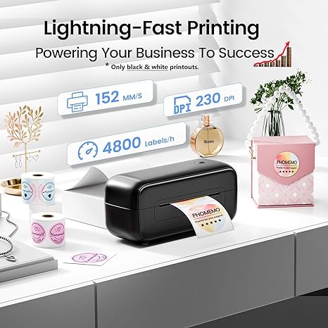 - √ 2024 Upgrade Version: Phomemo is committed to innovating thermal label printers. With its sleek curved design and a trendy black color scheme, it adds a touch of style and versatility.The pink shipping label printer not just a printer, it can also be a decorative piece for your home or office. A must-have partner for your business success.