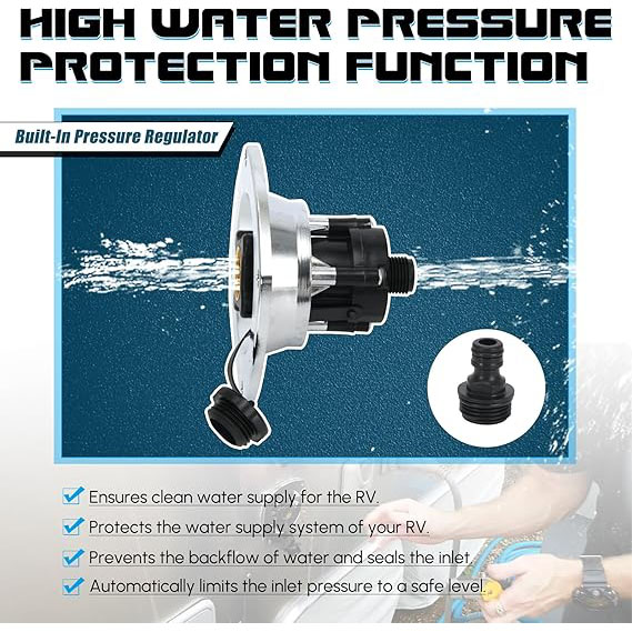 - 【HIGH WATER PRESSURE PROTECTION】: Designed to protect your vehicle’s water system from the variances and spikes in water pressure often encountered in different water supplies.You don’t need a separate water pressure regulator and conventional water inlet,automatically limiting the inlet pressure to a safe level 50 psi .(maximum inlet water pressure of 125 psi)