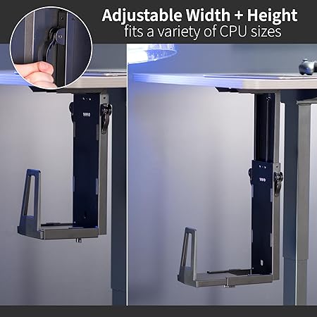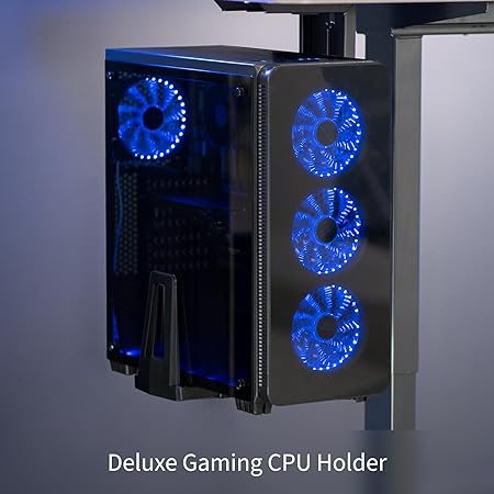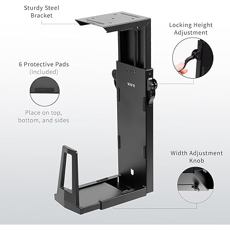 - Under Desk Gaming PC Mount – This CPU holder conveniently mounts your PC case under a desk or flat work surface for off of floor, easy access. Perfect for protecting your equipment and saving floor space.
