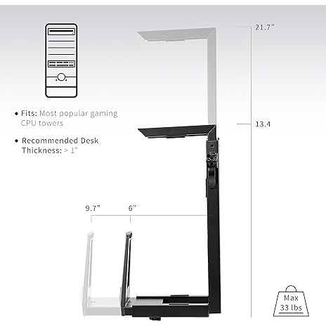 - Adjustable Frame – Fits most PC cases on the market with adjustable width from 6” to 9.7” and adjustable height from 13.4” to 21.7”. Supports weights up to 33 lbs.